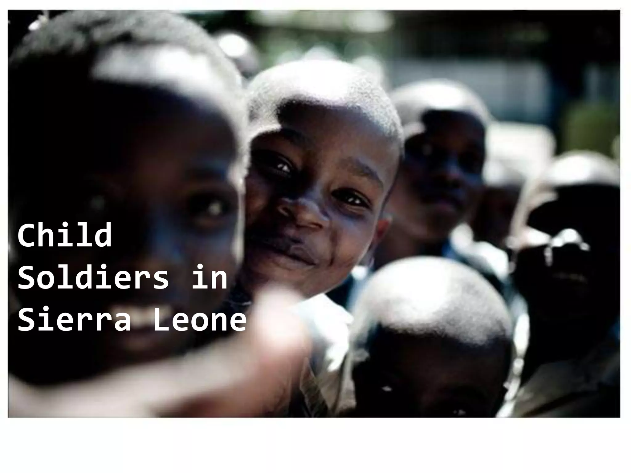 The document discusses the issue of child soldiers in Sierra Leone. It describes how the Revolutionary United Front recruited children as young as 5 years old to fight in the country's civil war during the 1990s. Many children were kidnapped and forced to commit violent acts, becoming addicted to drugs and suffering long-term physical and psychological trauma. While international organizations have attempted rehabilitation programs, many former child soldiers continue to struggle with reintegration into society due to the lack of support systems and job opportunities.