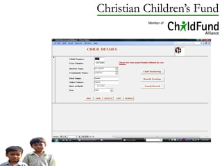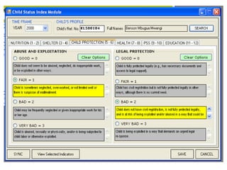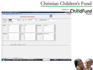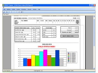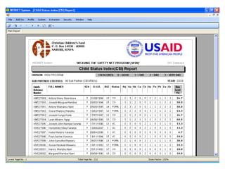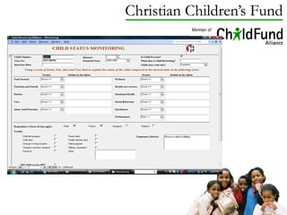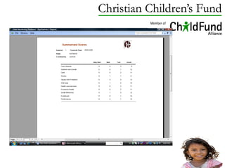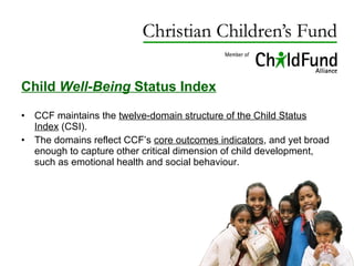 The document discusses Child Status Index (CSI), a tool used by Compassion Child Fund (CCF) to assess children's wellbeing across twelve domains. CCF uses CSI to measure program impact, monitor children's wellbeing, and fulfill other purposes like outcome assessment and reporting. The document outlines CCF's experience using CSI, including training community volunteers to collect and analyze CSI data. It also discusses developing databases to store and analyze CSI information and identifies challenges and recommendations for improving CSI implementation.