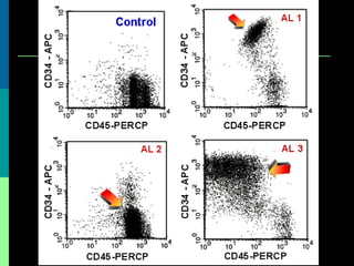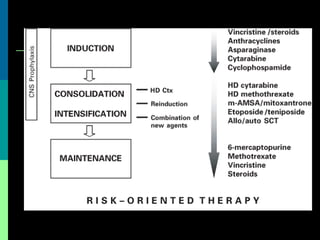 The document discusses acute lymphoblastic leukemia (ALL), which is the most common childhood leukemia. It makes up around 80% of childhood leukemia cases. The document covers the introduction, classification, etiology, diagnosis, clinical presentation, and treatment of ALL. It notes that the cure rate for ALL is around 85% with current treatments involving remission induction, intensification, and maintenance therapy. Prognosis depends on factors like age, white blood cell count at diagnosis, and the ALL subtype.