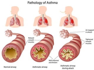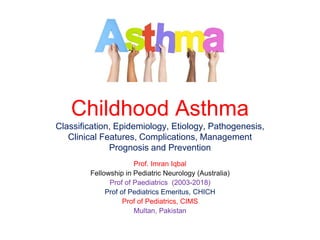 This document discusses childhood asthma, including its classification, epidemiology, etiology, pathogenesis, clinical features, complications, management, prognosis, and prevention. It provides case scenarios to demonstrate the diagnosis of asthma in children. Key points include that asthma is a chronic inflammatory condition of the airways causing episodic obstruction, it has a prevalence of 20% in Pakistani children, and is diagnosed based on a history of recurrent or intermittent respiratory symptoms and signs of bronchial obstruction on examination. Asthma is managed by avoiding triggers, using quick-relief and preventive medications, and treating exacerbations.