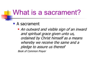 The document discusses the sacraments of baptism and holy communion, specifically regarding children. It outlines the history of practices and theological debates around admitting children to communion. The history shows that early church allowed infant communion, but the practice diverged over time. Modern debates weigh the priority of grace, children's place in the covenant, and understanding versus faith. Liturgical and pastoral issues are also considered in determining the next steps.