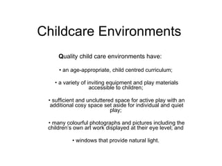 Children develop through interactions with their environment, which provides opportunities for engagement. A quality childcare environment has age-appropriate activities and materials that are accessible to children. It also provides various spaces for different types of play and displays the children's artwork. Arranging the physical space can guide children's behaviors and encourage or discourage certain activities. Providing defined play areas and organizing materials can suggest how children should play and engage with different activities.