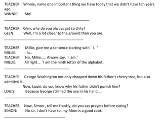 The document is a collection of short anecdotes showing young students giving clever or funny responses to questions from their teacher. The students demonstrate quick thinking skills and humor in their replies, such as a student saying "Maria" discovered America when asked who discovered it, or a student explaining their math is on the floor because they were told not to use tables.