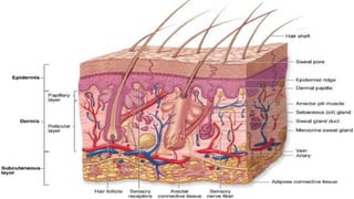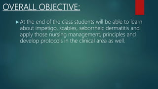 This document discusses several common integumentary disorders that affect children, including impetigo, scabies, and seborrheic dermatitis. It provides information on the definition, etiology, pathophysiology, clinical features, diagnosis, and nursing management of each condition. The overall objective is for students to learn about these skin disorders and how to apply appropriate nursing care and develop clinical protocols. Specific topics covered include the epidemiology, signs and symptoms, treatment options involving antibiotics, antifungals or other topical medications, as well as preventative measures like hygiene and isolation.