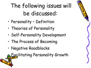 The document discusses children's personality development, covering definitions, theories, and influential factors such as inborn temperament, physical appearance, and early experiences. It reviews various personality theories, including psychoanalytic, behavioral, and humanistic approaches, and emphasizes the role of caregivers in facilitating personality growth. Key stages in self-personality development are outlined, along with roadblocks that can hinder progress.
