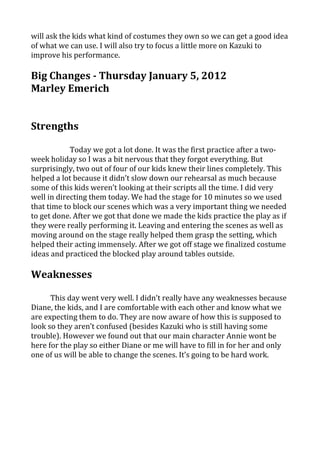 The rehearsal went well, with two kids knowing all their lines which helped speed up practice. Blocking scenes on stage helped the kids grasp the setting and improve their acting. The last rehearsal focused on adjusting lights and deciding music, though the director felt tired of repeating the play and let the kids get off track instead of taking the practice seriously.