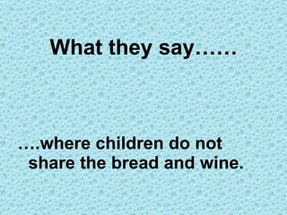The document shares perspectives from children about receiving communion or participating in church services. Some children feel left out for not being able to take communion. Others see communion as a way to feel close to Jesus or feel part of a community. The children also provide other insights such as enjoying carrying items for communion, baptisms making them feel like a new baby has joined the family, and some finding choir singing distracting from praying.
