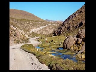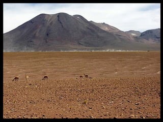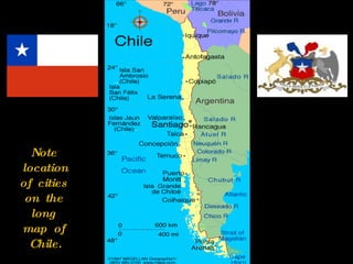 Chile is a long country located along the western edge of South America. It has a diverse landscape that includes the Atacama Desert in the north, the Andes Mountains throughout much of the country, and Patagonia in the south. Some key features mentioned include the capital city of Santiago, various volcanoes and mountain peaks, glaciers and ice formations, and Easter Island's famous moai sculptures off the coast.