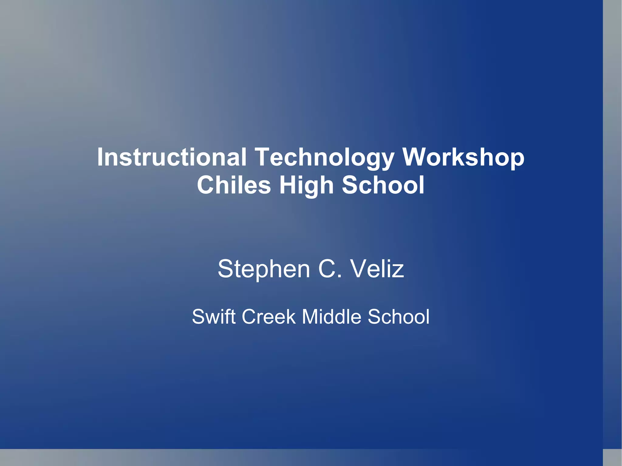 ![Need additional help? Just contact me: [email_address] http://stephenveliz.wikispaces.com/ Blogging @ www.StephenVeliz.com On Twitter - @stephenveliz](https://image.slidesharecdn.com/chilestechworkshoppresentation-111023105508-phpapp01/85/Chiles-HS-Tech-Workshop-Presentation-24-320.jpg)