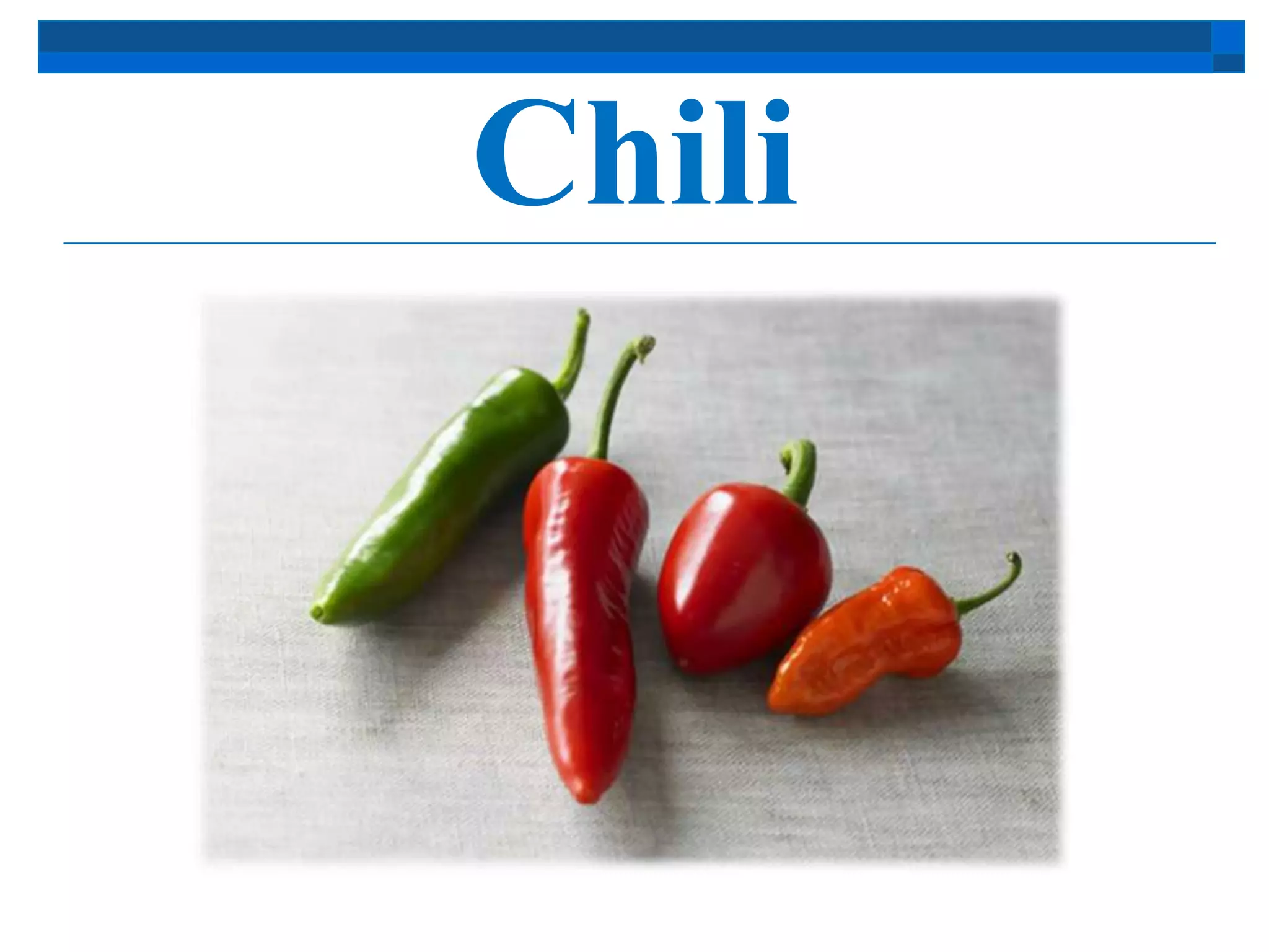 Chili originated in Mexico and South America and was spread by Spain to Asia, where it was incorporated into local cuisines. In Malaysia, chili is popular among growers as a short-term crop, with the main producing states being Johor, Pahang, and Kelantan. Chili varieties like Kulai, MC4, MC5, MC11, and MC12 are recommended for their yields and disease resistance. Chili is grown through seed propagation and transplanting seedlings, with regular maintenance including fertilizing, pest and disease control, and harvesting based on maturity levels.