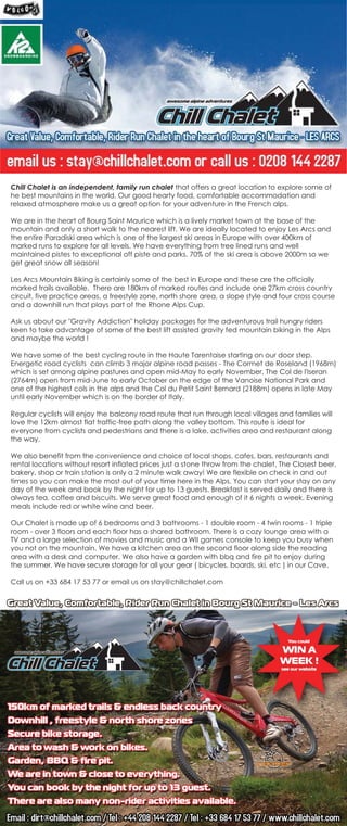 Chill Chalet is a family-run accommodation in Bourg Saint Maurice, ideal for exploring the French Alps with access to the vast Paradiski ski area and exceptional mountain biking trails. They offer comfortable lodging, hearty meals, and a relaxed atmosphere, along with nearby amenities and flexible check-in options. Guests can engage in various outdoor activities, with secure storage for equipment and a cozy lounge area for relaxation.