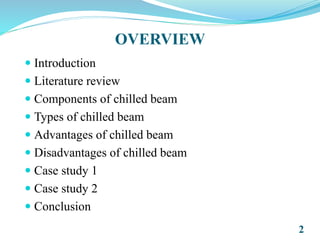 The document presents an overview of chilled beam systems, including their components, types, advantages, and disadvantages, as well as case studies demonstrating their application and effectiveness in energy savings. Chilled beams are identified as emerging HVAC technology developed for efficient heating and cooling in buildings, with specific designs for active, passive, and multi-service options. The conclusion emphasizes the lower lifecycle costs and reduced carbon emission potential of chilled beam systems compared to conventional HVAC solutions.