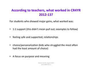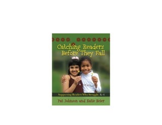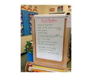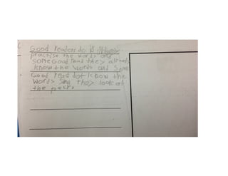 The document discusses strategies and observations from educators aimed at enhancing reading comprehension for students, highlighting the importance of personalized learning, choice, and supportive relationships. It outlines effective instructional elements including guided reading, writing about meaningful topics, and peer discussions. Key practices such as 1:1 support, the establishment of literacy centers, and varied reading opportunities are emphasized for fostering student engagement and success.