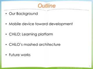 The document discusses CHiLO, a new mobile learning platform developed by CCC-TIES in Japan. CHiLO aims to make higher education accessible to more people by leveraging the growing use of mobile devices. It describes CHiLO's mashed architecture which integrates various components like Moodle, e-books, video lectures, badges and a learning community. The document also outlines challenges in developing e-textbooks for mobile and CHiLO's future plans which include a CHiLO library and reader to improve support for its e-books and learning objects across different devices.