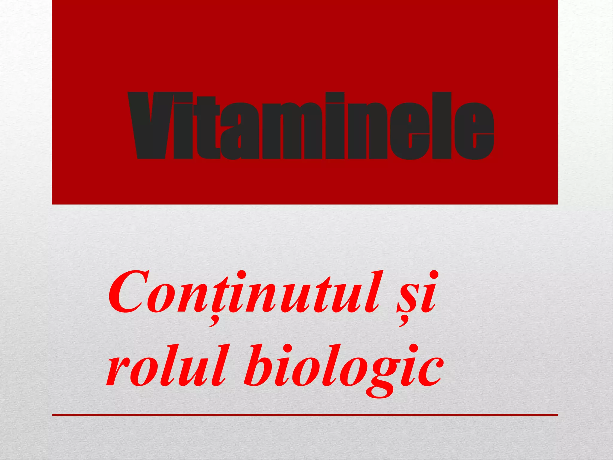 Vitaminele sunt substanțe organice esențiale, necesare în cantități mici pentru sănătatea organismului și trebuie obținute prin alimentație. Ele joacă roluri critice în procesele metabolice, cum ar fi asimilarea nutrienților și protejarea organismului, iar deficitul de vitamine poate duce la afecțiuni grave. Sursele alimentare de vitamine includ produse lactate, legume, fructe și uleiuri, iar pentru a conserva nutrienții, alimentele trebuie să fie proaspete și necontaminate.