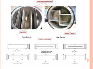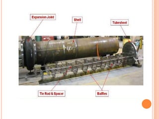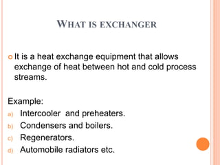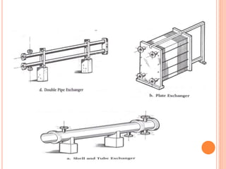 This document discusses heat exchangers, which allow the transfer of heat between two fluids without direct contact. It describes several types of heat exchangers including double pipe heat exchangers, which involve two concentric pipes, and shell and tube heat exchangers, which involve tubes inside a cylindrical shell. Shell and tube heat exchangers are widely used and involve tubes, tube sheets, baffles, and multiple passes to increase heat transfer. The document also discusses applications and advantages and disadvantages of different heat exchanger designs.