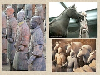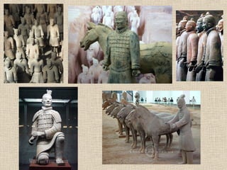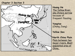 The document summarizes the history and geography of early China, including key dynasties and developments. It describes the Xia Dynasty as the first to develop a ruling structure with civilian government and law codes. The Shang Dynasty practiced agriculture and bronze making, with the capital eventually established at Anyang. The Zhou Dynasty lasted nearly 900 years and introduced concepts like the Mandate of Heaven to justify dynastic rule. Significant advances occurred during the Warring States period, including in warfare, irrigation, farming and trade (especially silk). The Qin Dynasty unified China for the first time under Qin Shihuangdi, who standardized currency, writing and built roads and the Great Wall. The Han Dynasty adopted Confucianism and a merit-