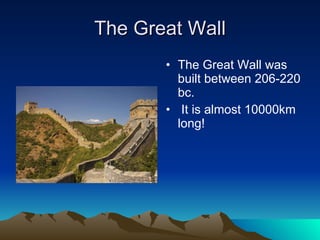 China has over 1.5 billion people and is one of the most powerful countries globally. The Great Wall was built between 206-220 BC and stretches almost 10,000 km long. Hong Kong is one of the richest parts of China where Cantonese rather than Mandarin is predominantly spoken.