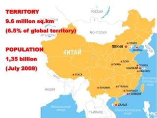 China is a large country with over 1.35 billion people and 9.6 million square kilometers of territory, making up 6.5% of the global total. The document discusses China's history dating back 3000 years, the importance of Confucianism in shaping Chinese social order and values, as well as China's transition to a modern economy focused on manufacturing, real estate, and international trade, leading to high GDP growth but also risks of overproduction and economic bubbles. China is a country of great contrasts, from modern cities to sacred mountains and peculiar local traditions.