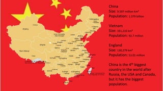 China is the most populous country in the world with over 1.3 billion people. It has a long history as the location of many dynasties and was ruled by emperors for most of its history. Some of China's most famous cities are Beijing, the capital, Shanghai, the most populous city, and Xi'an, the ancient capital with the Terracotta Army. China is also known for its Great Wall, Forbidden City, Tiananmen Square, Buddhism, Kung Fu movies, pandas, and the Mandarin language.