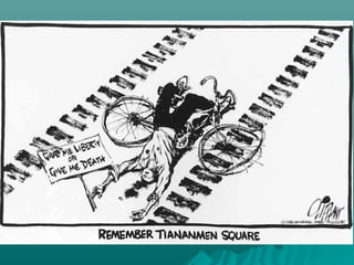 The document summarizes key events and policies in China after Mao Zedong's death in 1976. It discusses how moderates like Zhou Enlai gained control of the government and pursued diplomatic relations with the United States. Deng Xiaoping later came to power and implemented economic reforms known as the Four Modernizations to modernize agriculture, industry, science/technology, and national defense. This opened China's economy but maintained a one-party communist system, as shown by the Tiananmen Square protests in 1989.