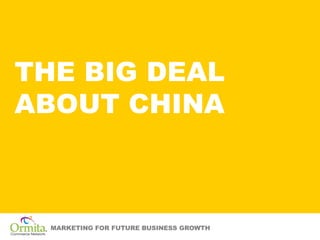 This document discusses opportunities for marketing and business growth in China. It notes that China has the world's fastest growing economy, and will likely become the largest economy by 2020. While brand recognition of foreign alcohol producers is currently low in China, the market for imported wines and beers is growing rapidly. The document recommends targeting younger Chinese consumers and using bartered advertising through various media channels, such as printed napkins in restaurants, billboards, and public transportation, to help foreign brands break through in the large Chinese market.
