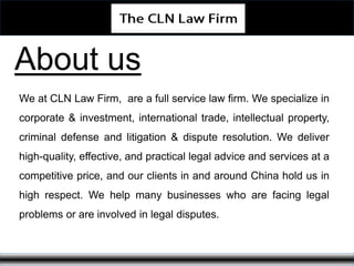 CLN Law Firm is a full-service law firm based in Shanghai, specializing in corporate and investment law, international trade, intellectual property, criminal defense, and litigation. The firm offers high-quality legal advice at competitive prices, focusing on helping businesses with legal disputes and challenges. CLN Law Firm is known for its compassionate service and efficient legal representation.