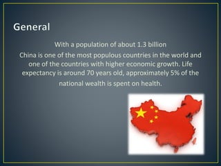 - China has a population of 1.3 billion people and spends around 5% of its national wealth on health care.