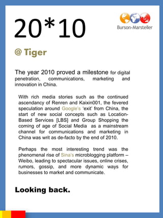 The document discusses digital communications trends in China for the year 2011. Some key trends highlighted include companies re-activating lapsed social media presences from 2009-2010, a rise in the use of infographics to visualize complex data, companies developing their own private social networks to engage audiences, and more executives curating their own online presences. It also notes the rise of location-based communications, social commerce, and integration of social channels into corporate websites.