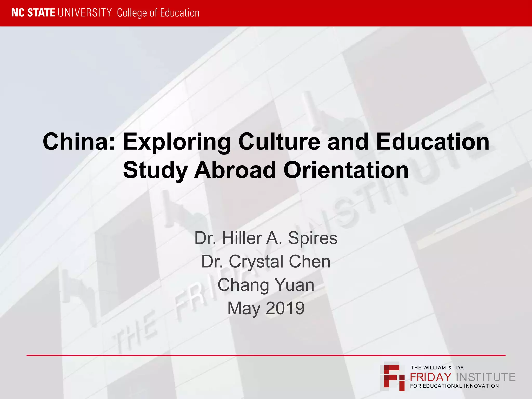 This document provides an orientation for a study abroad trip to China organized by the Friday Institute. It includes information about destinations in China like Beijing, Shanghai, and Suzhou. Fast facts are given about the culture, history and populations of these cities. The document also covers Chinese cuisines, manners, travel tips, and orientations to schools in Suzhou including Suzhou North America High School and Bai Ri Si High School that will be visited. Leadership and partnerships of these schools with NC State are summarized.