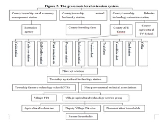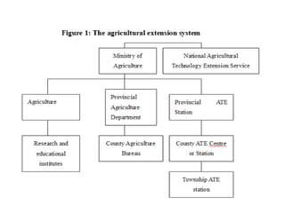 Efforts to establish agricultural extension services in China began in the early 20th century through universities and church-related institutions conducting agricultural research. A national extension service was organized in 1924 under the Ministry of Agriculture and Forestry. After 1949, China's agricultural extension focused on cooperatives during the First Five-Year Plan and increased production of grains, cotton, and livestock. Subsequent reforms decentralized extension and emphasized contracts between extension agents and farmers to incentivize the adoption of new technologies.