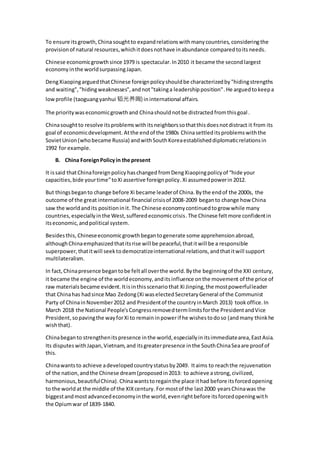 China has emerged as a significant player in global economics and politics, with its foreign policy shifting from a more reserved approach under Deng Xiaoping to a more assertive stance under Xi Jinping. The document examines China's historical foreign policy, its growing influence in Latin America, and the implications for U.S.-China relations amidst the geopolitical competition. China's strategy focuses on expanding economic ties and investments in developing countries while promoting multilateralism, but its rising presence has sparked concerns in the U.S.