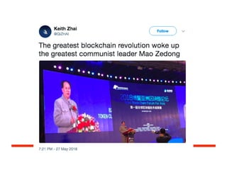 The document discusses various trends in China's advancements in AI, blockchain, and autonomous vehicles, highlighting significant investments and developments in these sectors. Key trends include Baidu leading in autonomous driving, Alibaba's dominance in e-commerce AI, and the growing role of AI in agriculture and healthcare. Additionally, the Chinese government plays a crucial role by providing substantial funding and support for technology initiatives, including a focus on blockchain technology.