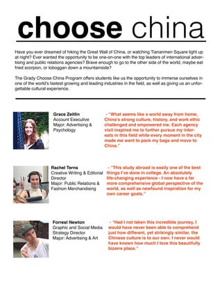 This document provides information about the Grady Choose China program, which offers students the opportunity to immerse themselves in China's advertising and public relations industries while experiencing Chinese culture. It shares testimonials from previous students who found the program life-changing. The bulk of the document then describes various activities and experiences the students had in Shanghai, Beijing, and Hong Kong, including visiting major advertising agencies, experiencing Chinese culture and fashion, dealing with language barriers, and more. It emphasizes that the program gave the students invaluable professional and cultural perspectives.