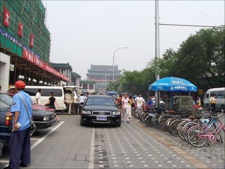 The document provides information about the geography, culture, and way of life in China. It discusses key locations like the Yangtze and Yellow Rivers, the Tibetan Plateau, and major deserts. It also describes traditional Chinese housing, clothing, food, education, recreation, and transportation. Important cities, landmarks, and animals of China are also mentioned.
