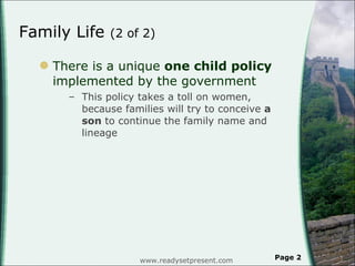 The document discusses various aspects of Chinese culture. It notes that China has a unique one-child policy implemented by the government which favors male children. When negotiating in China, it is important to be process-oriented and avoid losing temper or using pressure tactics to maintain relationships and goodwill. The Chinese calendar is lunar-based with each year represented by an animal, and there are twelve lucky red envelopes given during holidays and celebrations.