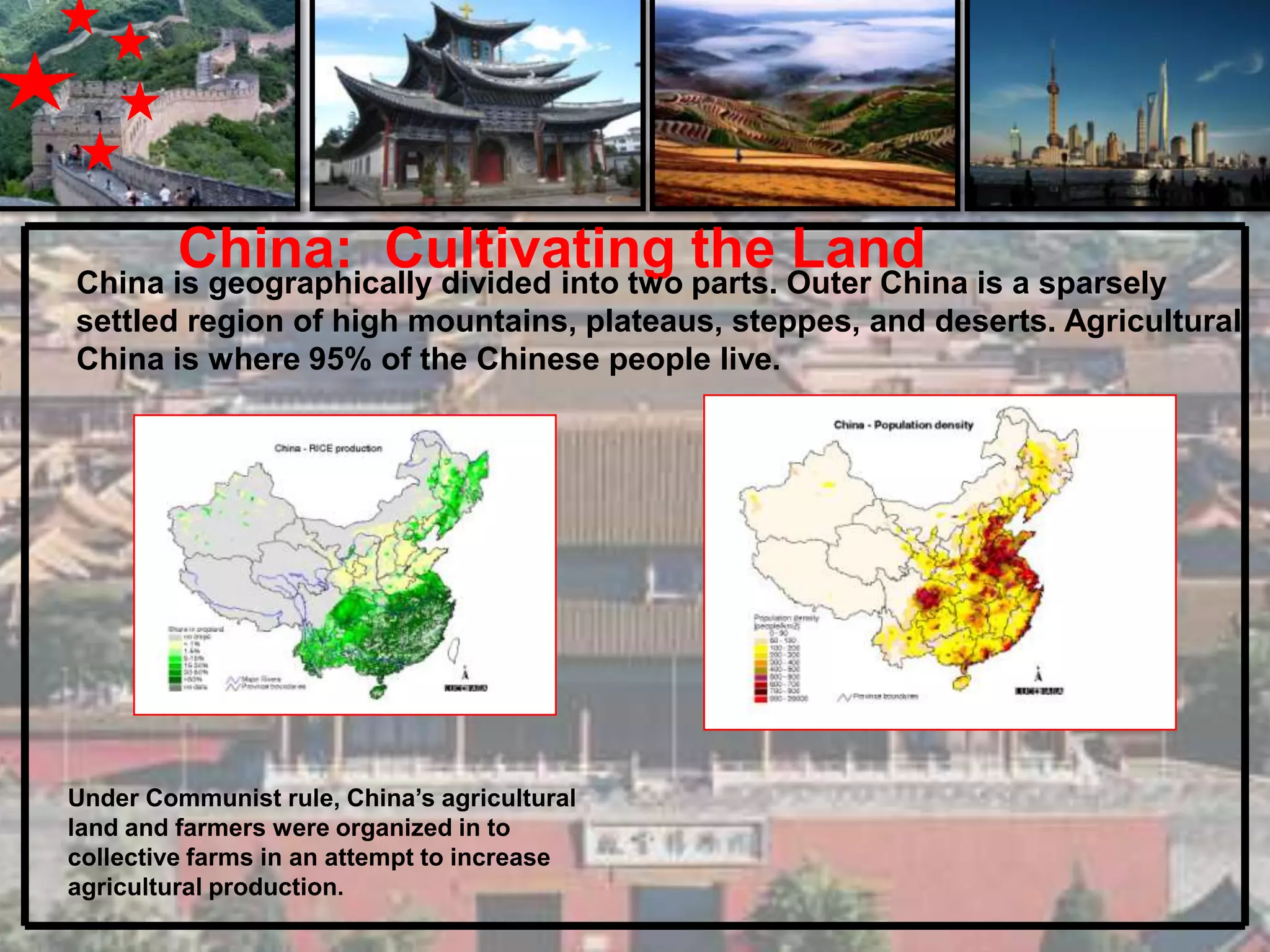 China is geographically divided into two parts - an inner agricultural region where 95% of people live, and an outer sparsely populated region of mountains, plateaus, deserts and steppes. The population of over 1 billion people makes China the most populous country in the world, though only 4% of its land can be cultivated. Under Communist rule in the 20th century, collective farms were established to increase agricultural production. Since economic reforms in the late 1970s, China has experienced rapid economic growth and development, becoming the world's second largest economy through industrialization, international trade, urbanization and investment.