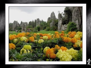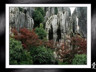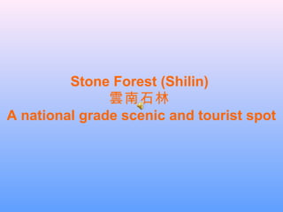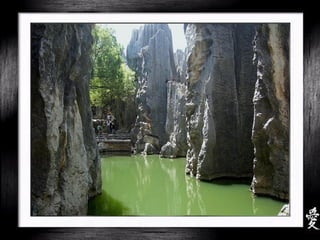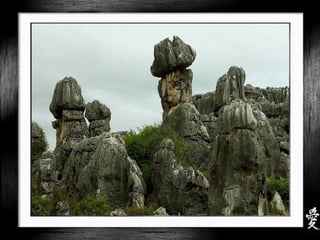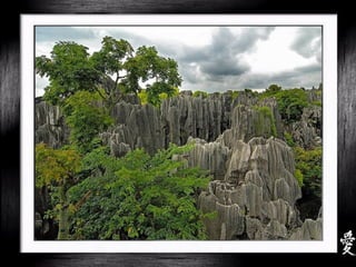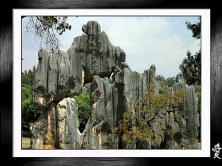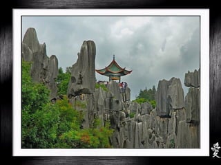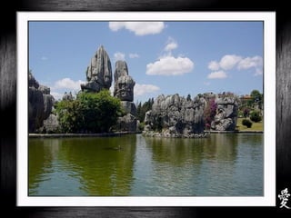 The Stone Forest is a scenic area located 85km southeast of Kunming, China. Covering hundreds of square kilometers, it features numerous limestone peaks that rise abruptly from the ground resembling bamboo shoots, forests, and pagodas. Research shows the rock formations are over 270 million years old and were formed from an ancient ocean that receded over millions of years, gradually eroding the giant rocks into their current strange shapes. Visitors can wander along walkways between the peaks admiring the unique stone mountains that form poems and pictures like "Lotus Peak" and "Rhinoceros Admiring the Moon".