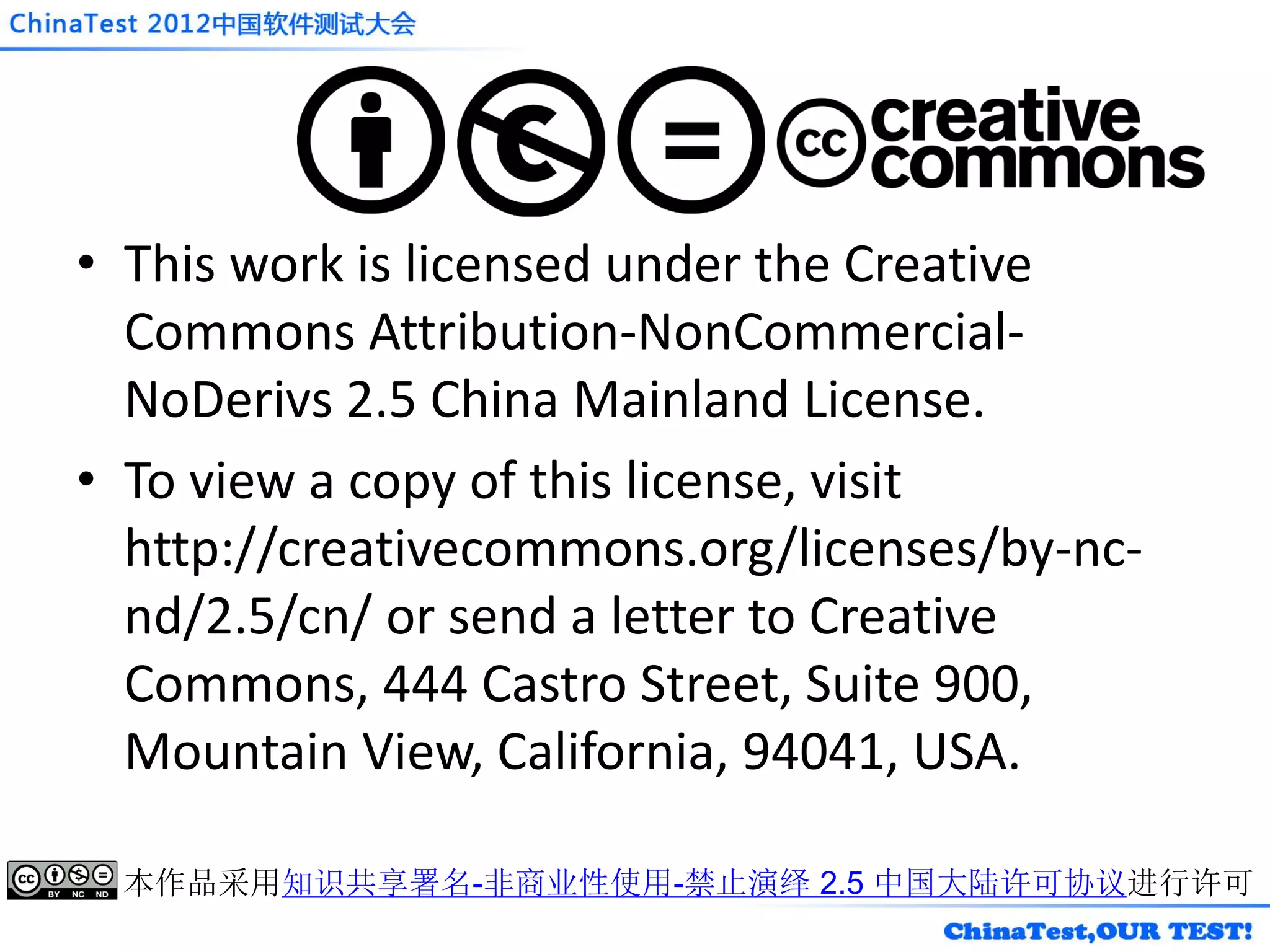 本作品采用知识共享署名-非商业性使用-禁止演绎 2.5 中国大陆许可协议进行许可