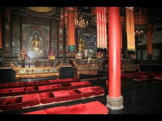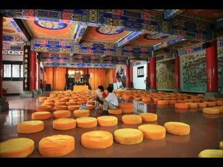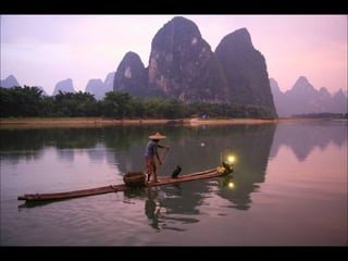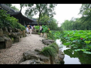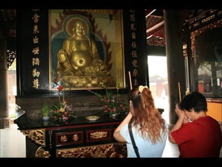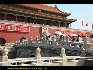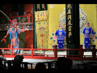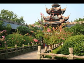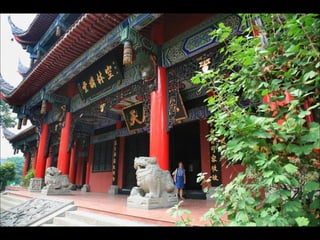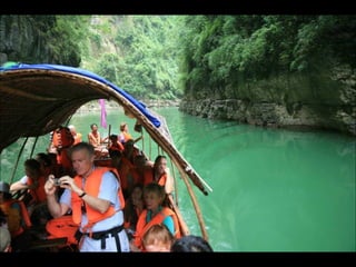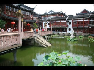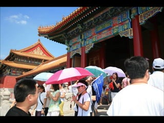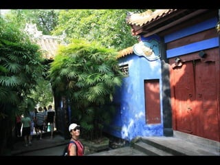 The document provides photos and descriptions from various locations in China, including Beijing, Xian, Chengdu, Shanghai, Suzhou, the Yangtze River, Guilin, Yangshuo, Guangzhou and more. Sites mentioned include the Forbidden City, Temple of Heaven, Wild Goose Pagoda, Leshan Buddha, classical gardens, temples, and examples of local culture and opera performances. Descriptions note historical and cultural aspects as well as modern influences in China.