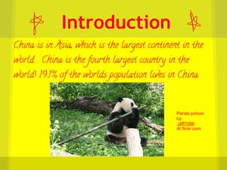 China is located in Asia and has over 1.3 billion people. It has a long history and was the origin of many important inventions like paper, printing, and gunpowder. Some key facts about China include that it has the largest population in the world, the Great Wall of China is over 5,500 miles long, and Chinese New Year is one of the most important holidays celebrated in the country with traditions like giving red envelopes. China also has a diverse landscape and is home to iconic animals like giant pandas and the endangered South China tiger.