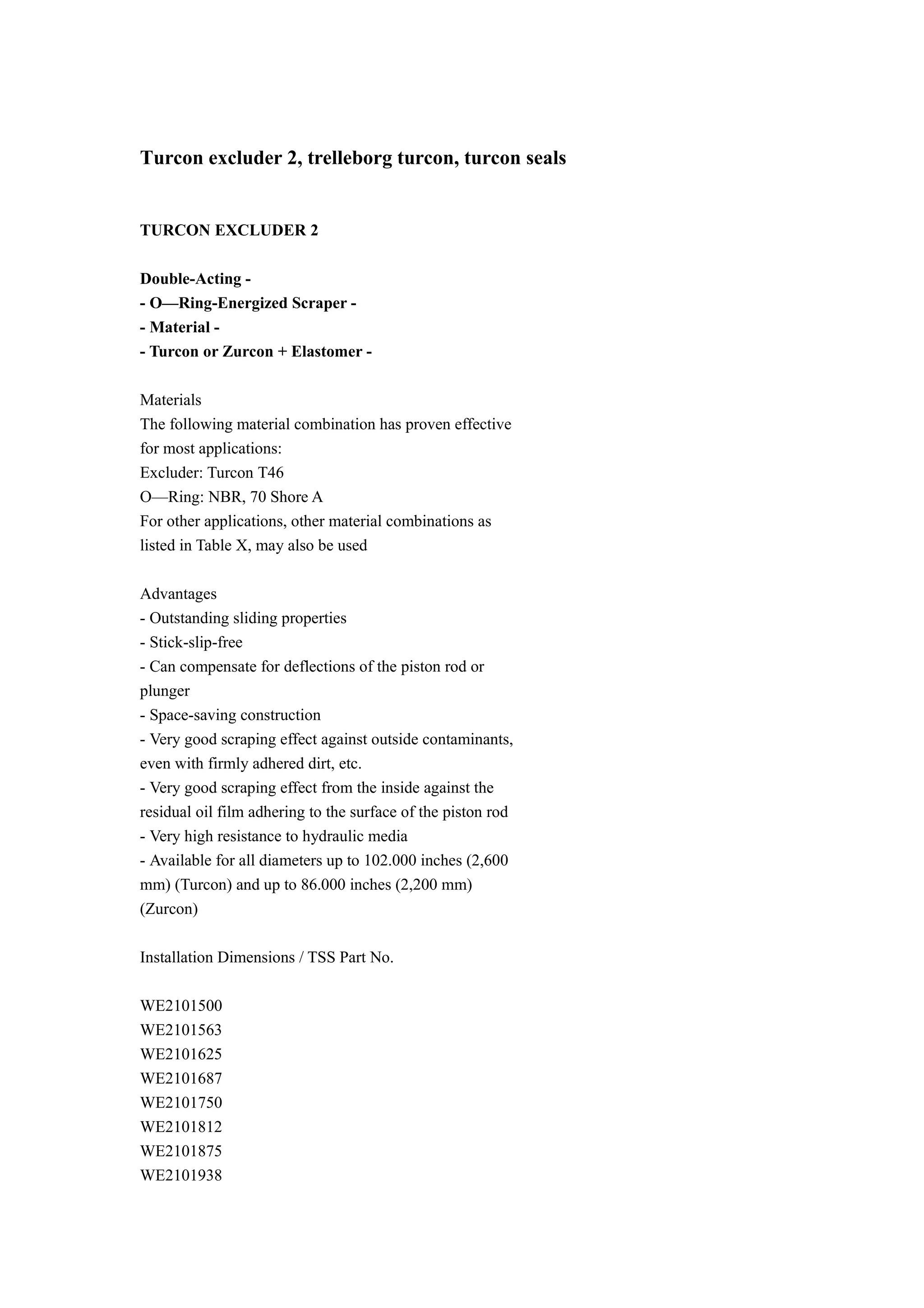 The document discusses the Turcon Excluder 2 double-acting seals made from Turcon or Zurcon materials, optimized for various applications with outstanding sliding properties and a high resistance to hydraulic media. It highlights the advantages such as space-saving design and effective scraping against contaminants and residual oil. Installation dimensions and part numbers for a wide range of sizes are also provided.