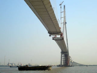 The Hangzhou Bay Bridge in China is the longest sea-crossing bridge in the world at 36 kilometers long. It took 9 years and 600 engineers to plan and design the S-shaped bridge, which links Ningbo and Jiaxing and cuts 120 km off the drive between Shanghai and Ningbo. The unique bridge has a 10,000 square meter service center in the middle with facilities like a restaurant, hotel, and observation tower to view the bay's extraordinary tides. The specially designed bridge can withstand typhoons and hurricanes in the bay known for its fast-moving 30 kph tides.