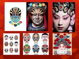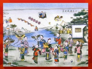 Chinese art and painting places great emphasis on nature, balance, and harmony between humanity and the natural world. Landscape painting is considered the highest form, and paintings often feature landscapes, flowers, birds, and other natural subjects. Key principles that guide Chinese painting include observing rhythm and movement in nature, using space and brushwork effectively, and drawing from artistic traditions. Calligraphy, paper cutting, kite making, and knot tying are examples of Chinese folk art forms that live on today.