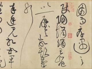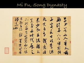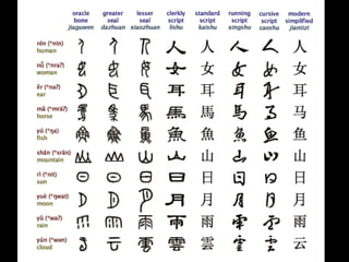 This document provides an overview of Chinese calligraphy and the development of written scripts in China from oracle bone style through various dynasties. It traces the evolution of Chinese characters from early pictographs to modern script styles like seal script, clerical script, standard script, running script, and grass script. The document also describes the traditional tools of calligraphy like brushes, inks, paper, and inkstones. It provides examples of famous calligraphers' works from different dynasties to illustrate the various script styles.