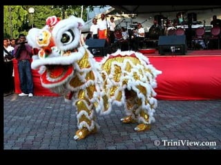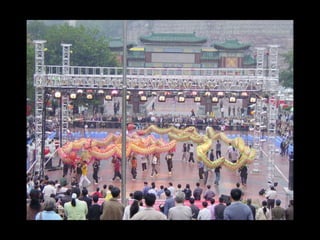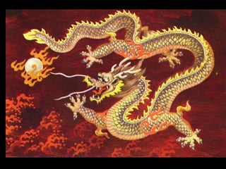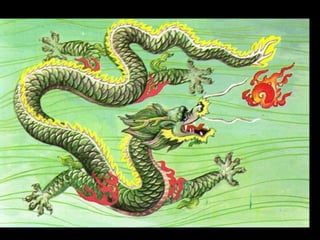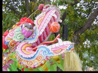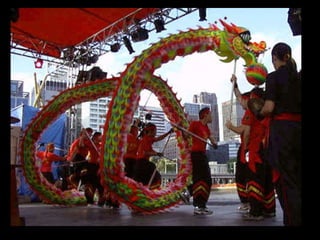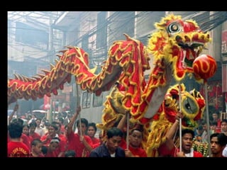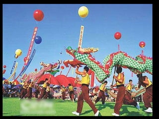 Chinese New Year is one of the most important holidays in China, celebrated for 15 days based on the lunar calendar. Decorations often feature red colors, cherry blossoms, and sunflowers to symbolize prosperity, luck, and a good new year. A significant festivity is the dragon dance, where a large puppet dragon is paraded through the streets with help from puppeteers. Dragons are highly symbolic in Chinese culture and represent qualities like good luck, power, wisdom, and kindness that people hope to possess in the new year. Chinese dragons have four claws, no wings but can fly, and are covered in scales rather than being viewed as evil like some Western dragons.