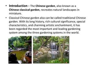 Chinese gardens were designed to recreate natural landscapes in miniature and have a history of over 3,000 years. Early gardens were built for royal families starting in the Shang Dynasty but private gardens became popular during the Han Dynasty. The art of Chinese gardens matured during the Tang and Song Dynasties. Key elements included rocks, water, flowers, architecture and the use of pathways and bridges to guide visitors through a series of concealed and surprising scenic views. Symbolic meanings were associated with different plants and structures.