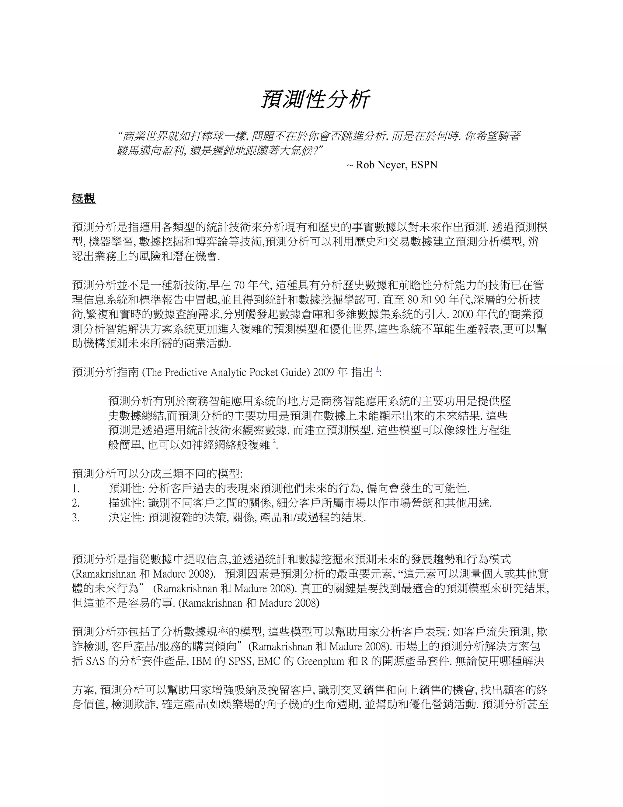 此文档探讨了预测分析的概念及其在商业中的应用,强调了通过统计技术分析历史数据以预测未来结果的重要性。预测分析模型有三类:预测性、描述性和决定性,能够帮助识别商业机会和管理风险。数据挖掘则是从数据中发现潜在关系和模式的关键过程,增强了预测分析的效果。