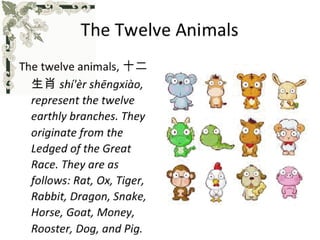 The document provides descriptions of the 12 animals in the Chinese zodiac - Rat, Ox, Tiger, Rabbit, Dragon, Snake, Horse, Sheep, Monkey, Rooster, Dog, and Pig. For each animal, it summarizes their personality traits and compatibility with other signs. It notes that this year is the year of the Snake and next year will be the year of the Horse.