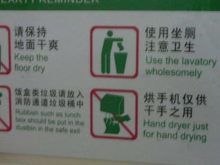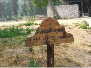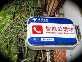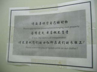 The document discusses signs from China during the 2008 Olympics that were intended to help tourists but were difficult to understand due to incorrect English translations, known as "Chinglish". It asks readers to try and decipher the intended meanings of the signs and rewrite them in clear English.